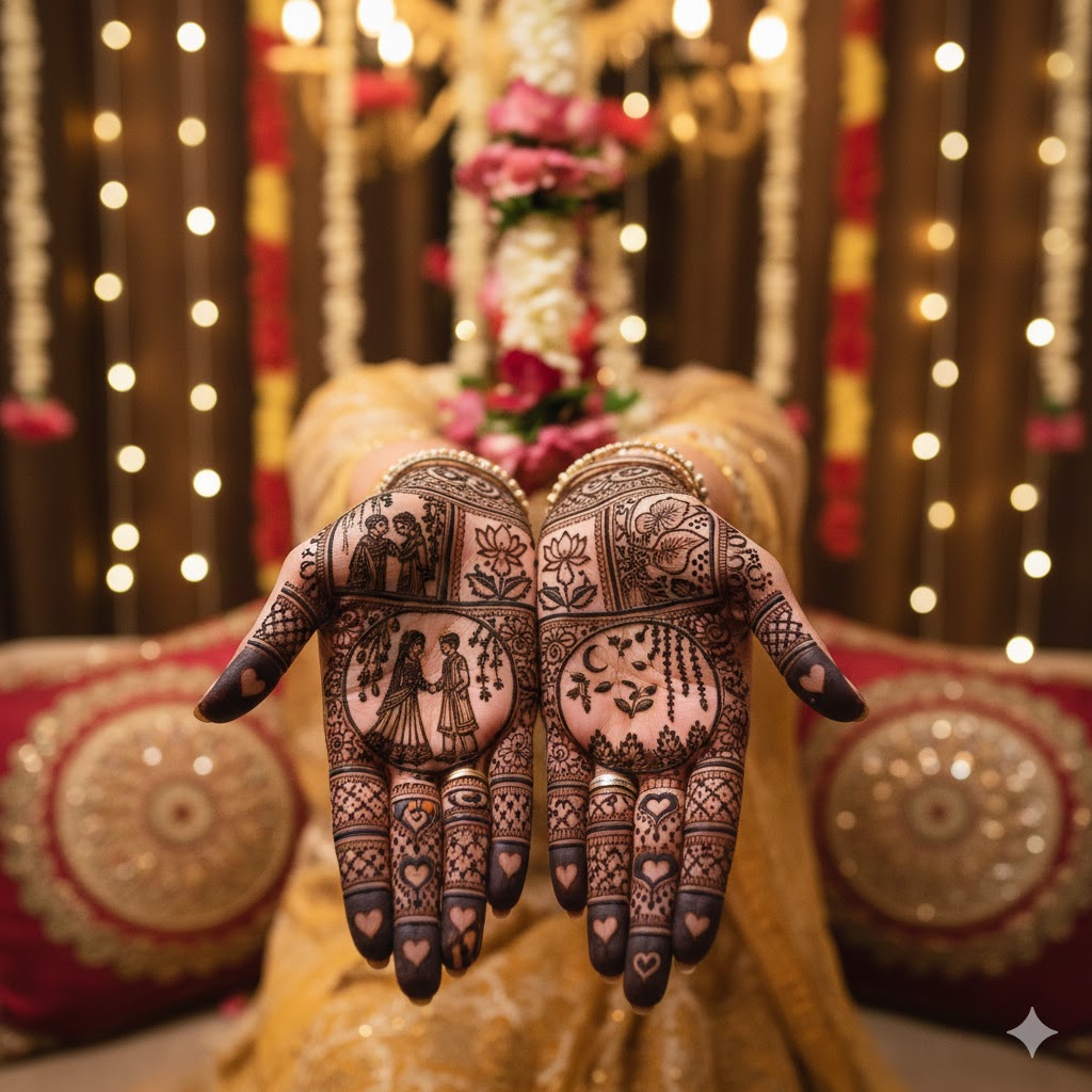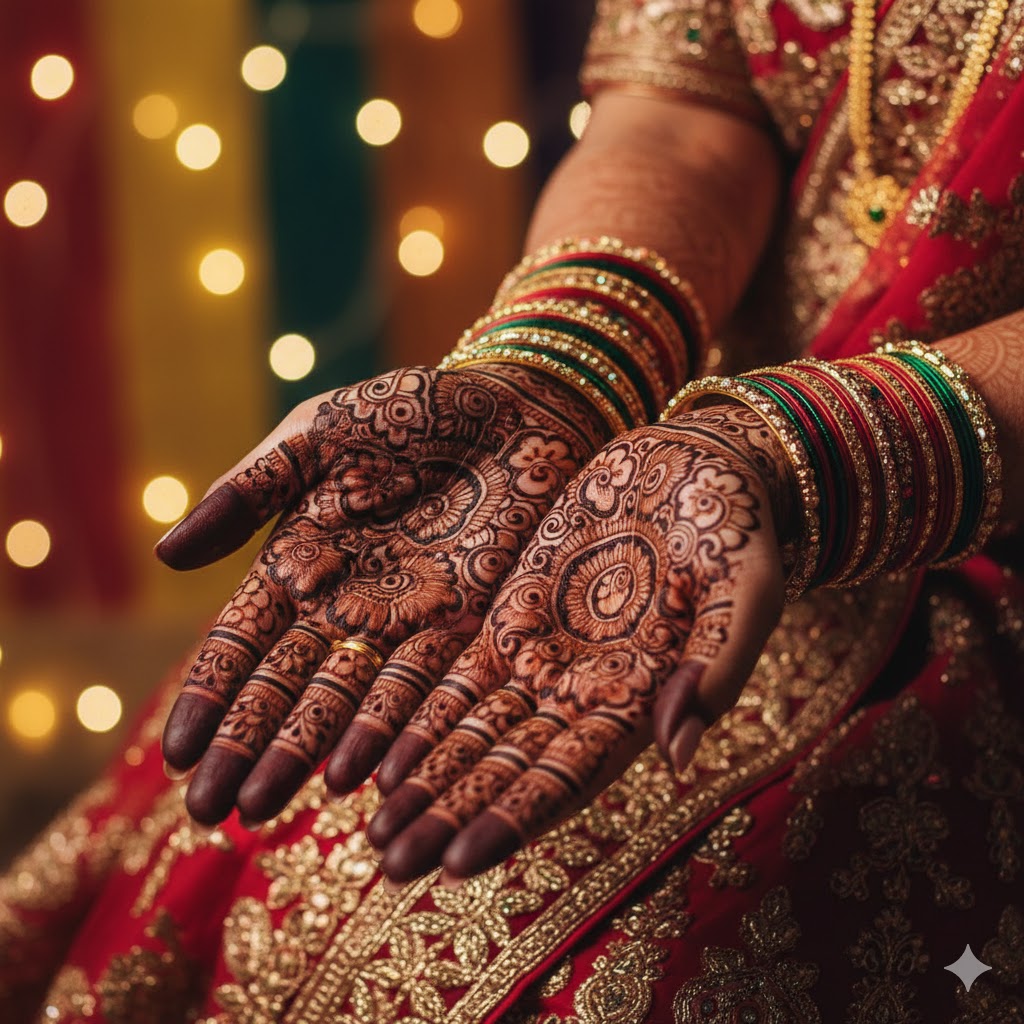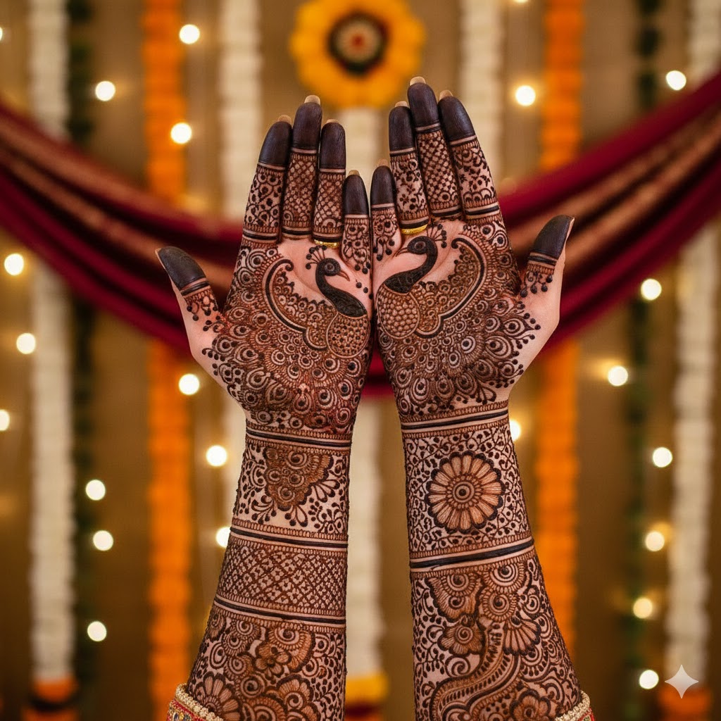 Detailed bridal mehndi covering full hands and arms, traditional floral and paisley patterns.