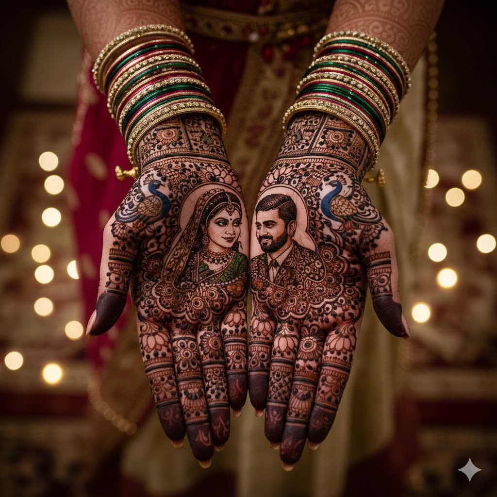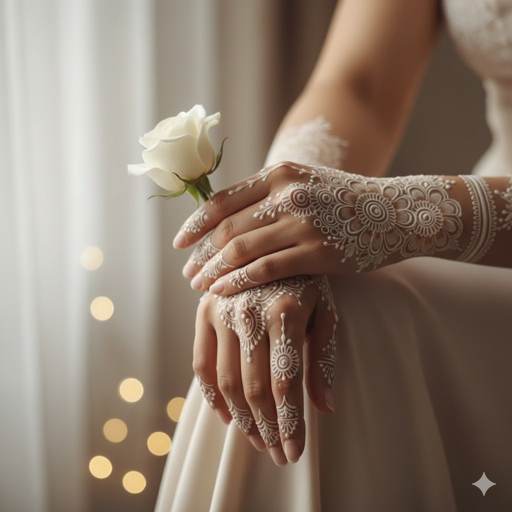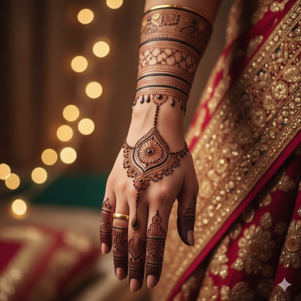 Detailed bridal mehndi covering full hands and arms, traditional floral and paisley patterns.