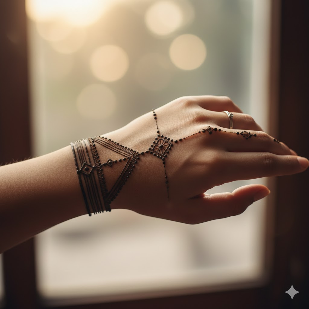 Combination of Arabic and Indian style mehndi, floral + geometric.