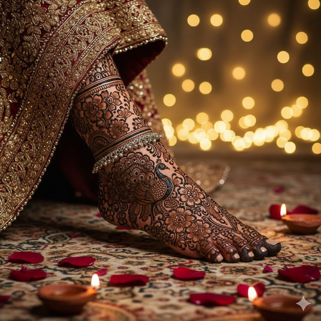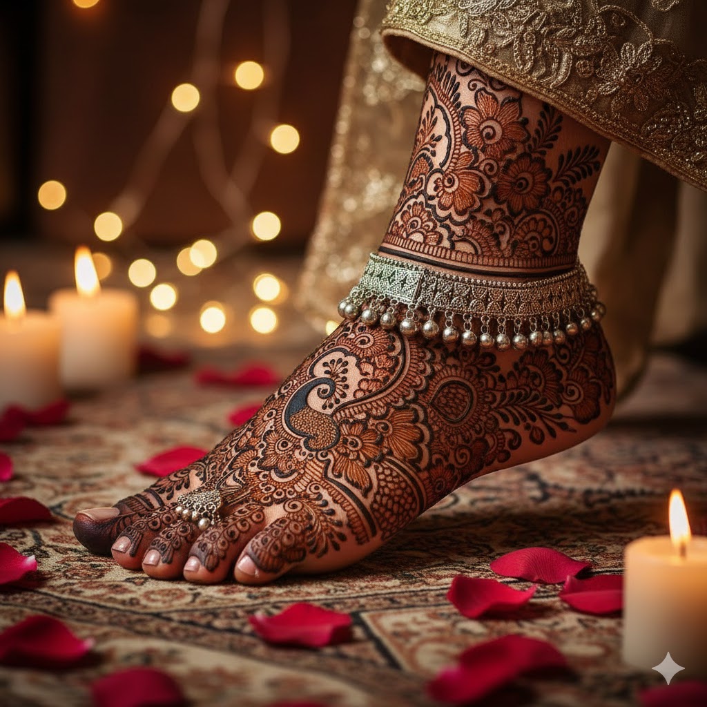Bridal mehndi designs covering legs, traditional patterns with elegance.